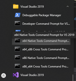 Ad esempio, se abbiamo installato Visual Studio 2019, possiamo invocare il collegamento x64 Native Tools Command Prompt for VS 2019 come mostrato nella figura seguente: